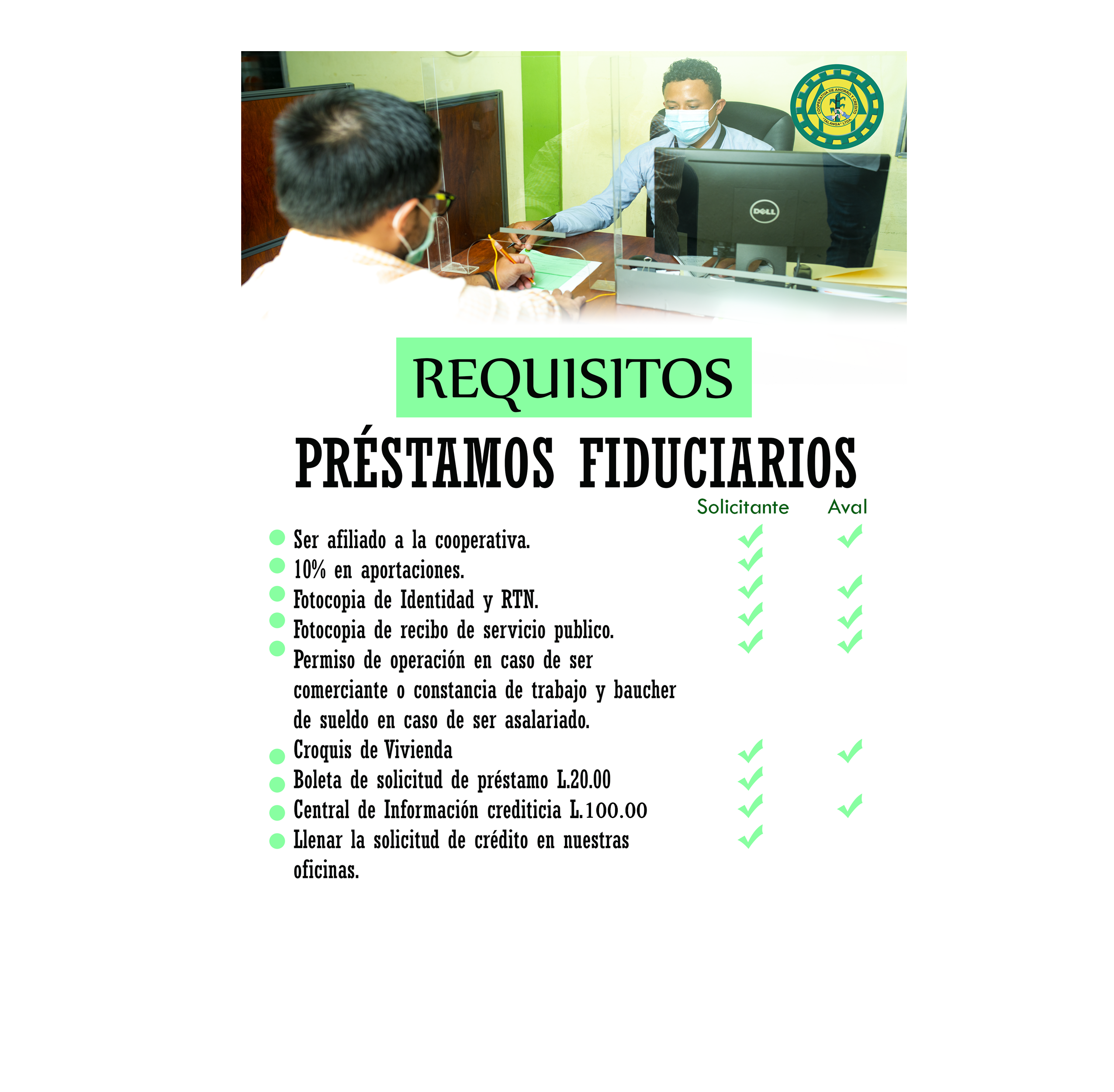 Montos hasta 10 veces lo que mantiene en las cuentas de aportaciones con un máximo de L. 300,000.00 Destino: De acuerdo a las necesidades del cliente. Plazos hasta 84 meses. Tasa del 21% anual.